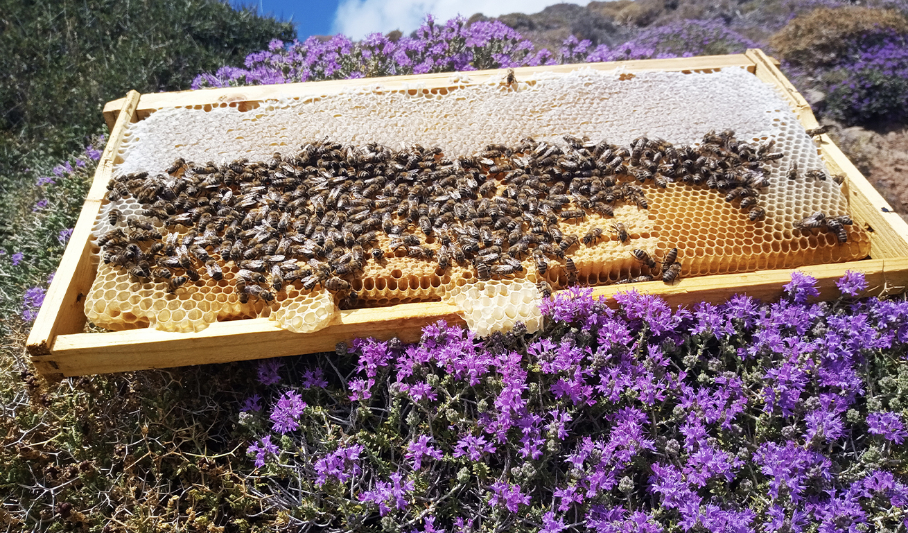 Experience the authenticity of our honey harvesting process by witnessing an original, non-processed honeycomb frame directly from our island's mountainside beehives. Awaken your senses as you sample our array of products, including our renowned thyme honey, honeycomb, and traditional pasteli bites. Each offering is crafted with love and dedication, providing a delightful taste of our artisanal creations.